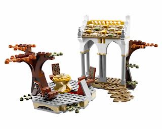 the setting has elven wall arches, a weapon rack, steps, tree, 3 chairs and a podium with minifig launcher and a hidden eye of sauron.